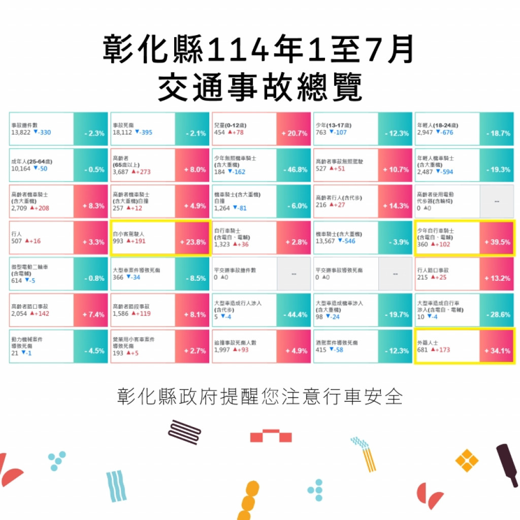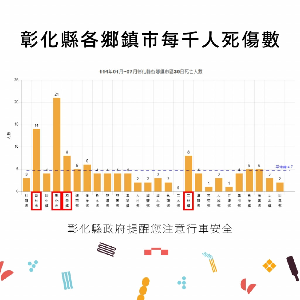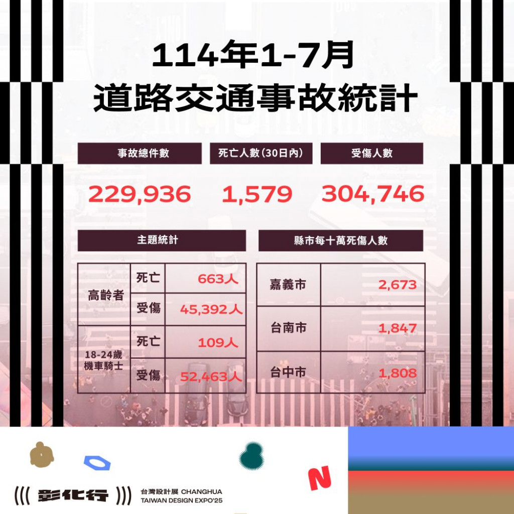 三、附件為「114年1-7月全國道路交通事故統計、彰化縣交通事故總覽、本縣各鄉鎮市每千人死傷人數及肇事熱點」共4份統計資料宣導圖,