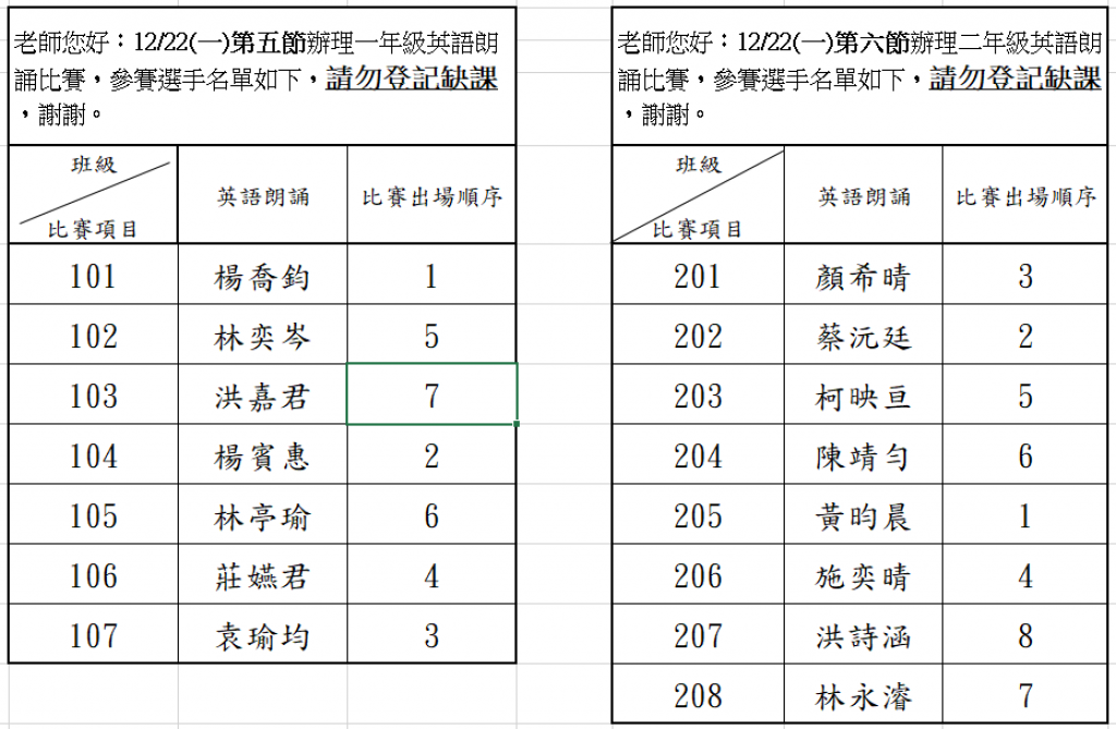 114學年第一學期英語朗讀競賽出場序,如附圖。 競賽時間、地點: