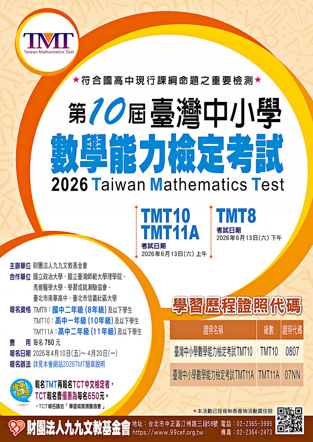 | 六、 | 報名費用每名學生750元,為幫助(中)低收入戶同學,本會將補助每名學生免收工本費參加本次測驗,計200個名額,額滿即不再受理報名。申請辦法請參閱本會網站。 |
